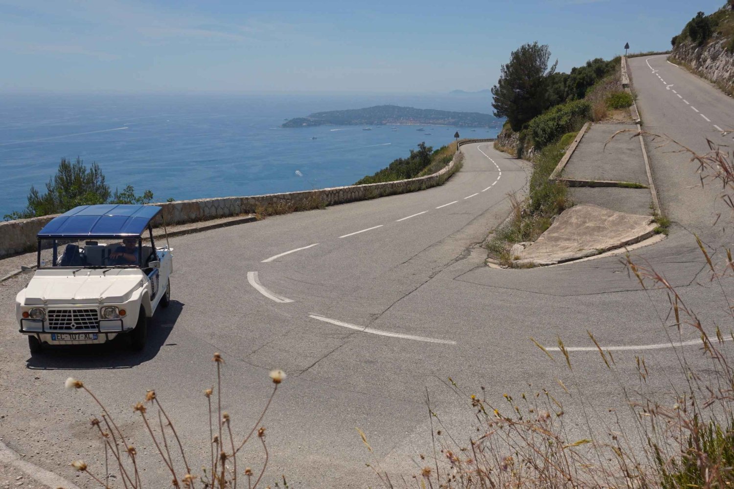 Panoramische tour langs de Franse Rivièra tussen Nice en Monaco in een vintage Citroën Méhari, met spectaculaire stops, reisverhalen en onvergetelijke fotomomenten.